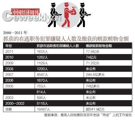 《中国经济周刊》从最高检历年“两会”上的 工作报告整理得知,自2000年底最高检会同公安部组织开展追逃专项行动以来,至2011年,检察机关共抓获在逃职务犯罪嫌疑人18487名。而据最高检 公开发布的2005、2007、2009—2011年五年的数据显示,我国这五年共缴获赃款赃物金额达到541.9亿元。