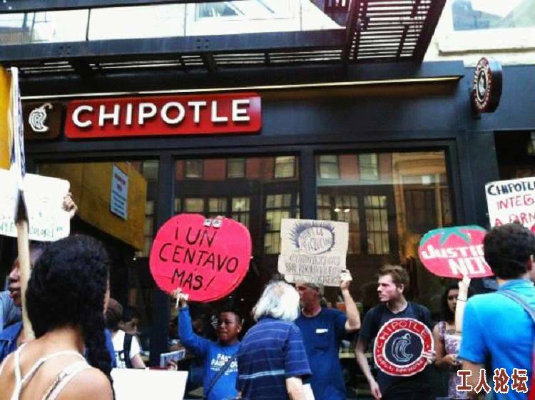7月25日纽约、奥克兰等20多个城市的群众开展集会,要求chipotle公司尊重土豆行业农业工人权益,签订公平的食品供应协议。(翻译:工人论坛 李汉唐)
