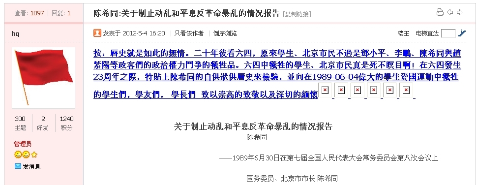 回复 10楼红山茶的帖子“红旗”网管理员HQ是反革命,也封了我的2个IP,原因就是我主张新民主主义革命。向导 发表于 2012/8/7 14:53:00