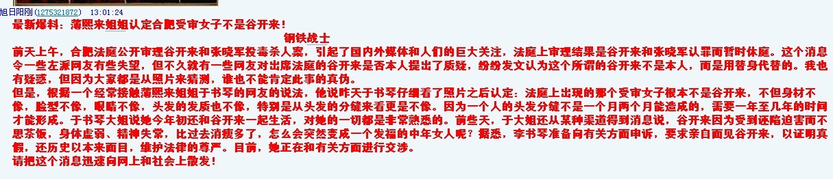 等,今天还真派上了‘用场‘。咱只强调一点即可击败河蟹弄虚作假的真实本质。一个人的面部无论怎样变化,面部轮廓、眼睛、眉间距是无法改变的,虽然照相角度的不同也可有稍有差异;但是一个成年人的鼻头再怎么变化也是没有差异的。图中出庭的’谷开来‘的鼻头明显丰满有肉;而同薄熙来合影的谷开来却实尖尖的鼻头。几个月的软禁不管生活如何好,即使每天山珍海味、燕窝鱼翅,肉也不可能长到鼻尖上去。这就够了。笔者无意替谷氏夫妇辩驳,但是河蟹虚伪奸诈的本质必须揭露。