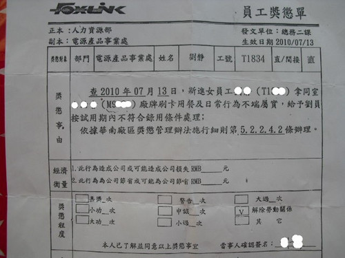 上图 正葳厂某女工因借室友厂牌吃饭而被开除