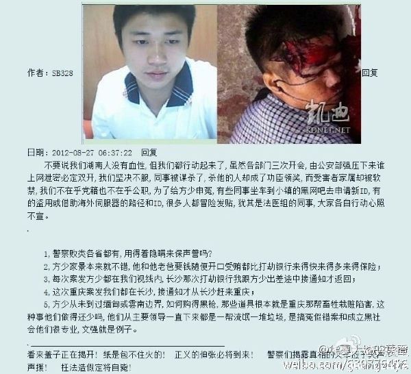今天有人自称是曾经参与支援重庆抓捕周克华的湖南警察,在凯迪网络爆料被打死的人是一个名字是方少的警察。原帖被很快删除,但是很多网友在微博和博客中发表了这个消息。