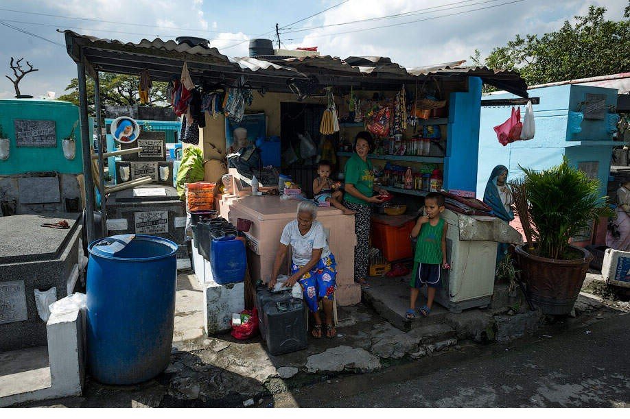 据悉,陵园内的“街道”上人来人往,倒像是一个居民区。“城北公墓”因此也成为菲律宾有名的墓地贫民窟,约5万无家可归的贫民被迫在这里与往生者分享空间。这里的居民对于生与死有着比常人更豁达的态度,许多人认为死后继续与亲人们“生活”在一起,也是一种不错的选择。