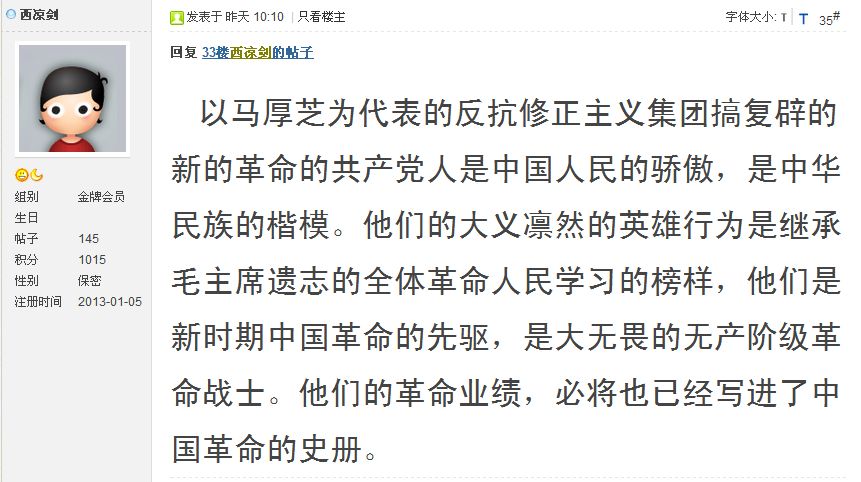 观感二: 我注意到, 把早已蛹变为资产阶级政党的邓产党仍然称为“修正主义集团”, 这一点经常挂在三中全会派及其门徒、五毛们的嘴上, 在西凉剑的几个帖子里也是这样以“修正主义集团”来称呼邓产党的。 请同志们不要小看了这个称呼, 这里面包含了事关“政权性质、路线是非”的大是大非的问题。