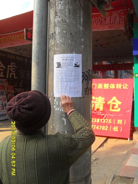 » 中国真共产党党员刘馨宇同志在湖南永州市祁阳县街头张贴中革中央
