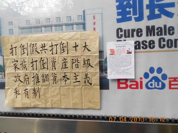 真共产党员吾思毛同志、无产阶级革命家李非同志二零一三年四月七日在湖南长沙张贴中革中央大字报,向假共资产阶级反动政府发起猛烈进攻。同时以此行动声援被假共资产阶级政府抓走的真共党主席周群同志,并向资产阶级假共政府宣战:打倒假共,打倒十大家族资产阶级政府,推翻资本主义私有制建立社会主义公有制!