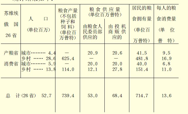 根据粮食人民委员部的统计资料,从1917年8月1日到1918年8月1日,俄国由国家收购的粮食约为3000万普特。下一个年度约为11000万普特。再下一个收购年度(1919—1920年)头三个月的数字看来可以达到4500万普特,而在1918年同时期(8—10月)只有3700万普特。
