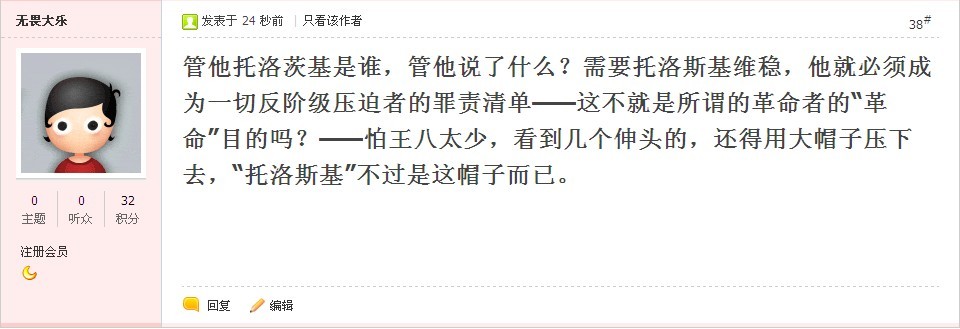 顺便说一句看法,这里主帖《浅议“托派”问题》,是一个长袖曼舞的大忽悠贴,但是不管它用心怎样巧妙,只要他别有用心,只要他的本质是反马列主义的,就一定要暴露出来。但是,雪落网友却根本看不出来,还很推崇,相见恨晚,还“向原作者致以崇高的革命敬礼!”