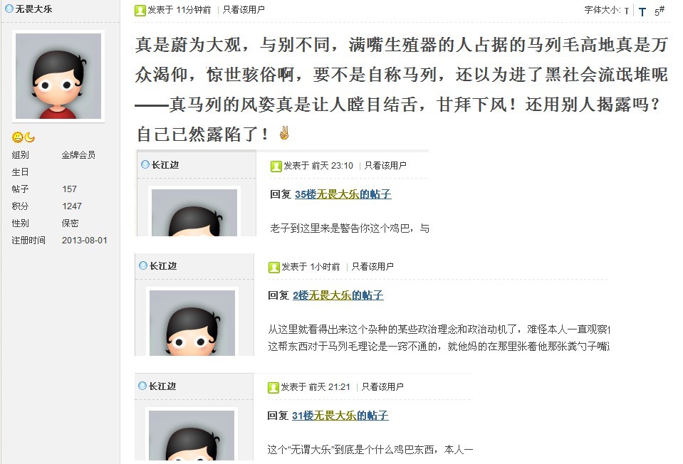 还是那句话,这里不是窑子,不用一进来就脱裤子亮家伙!——杂碎!不过也许这里是,只进下半身就足够了。刚还听马列大佬们挥舞大棒,念念有词,忽又来个裸露癖,生殖器满屏,——这打脸的可不是我,是你们自己。