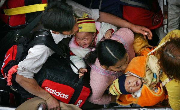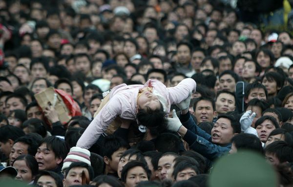 2008年,我国南方遭遇罕见冻灾,交通遇阻。1月31日,广州部分列车恢复运行,大批乘客聚集在火车站广场外准备进站。一乘客晕倒在人群中,乘客把其抬高救出。摄影:陈奕启