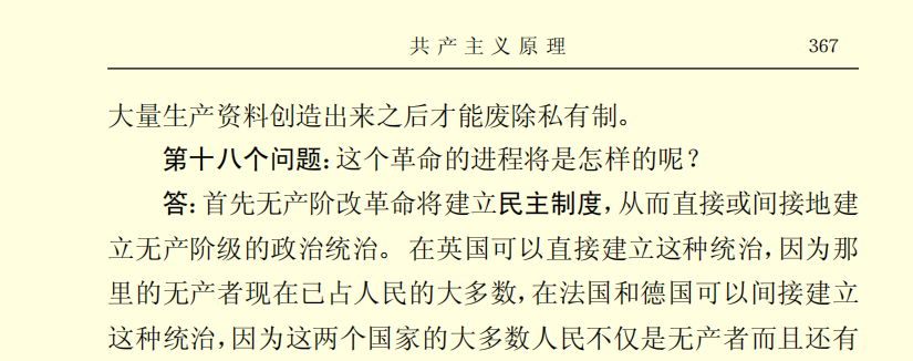 国家论者还引述了恩格斯在1847年写的《共产主义问答》第十八问中的一句话“首先无产阶级革命将建立民主的国家制度”来佐证,马克思恩格斯也主张无产阶级可以建立民主国家来达到无产阶级的目的,现就这个问题展开论述。 就国家论者引述的这句话,笔者查阅了《马克思恩格斯选集》第一卷(1972年版)第219页,以及《马克思恩格斯全集》(1956年版)第四卷第367页,两个版本都是这样的:“首先无产阶级革命将建立民主制度”,请看《马克思恩格斯全集》(1956年版)第四卷第367页截图(注意:这个版本由于刊印错误,误把“无产阶级”印成了“无产阶改”了):