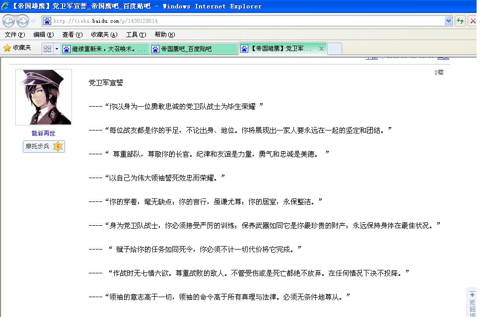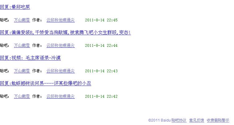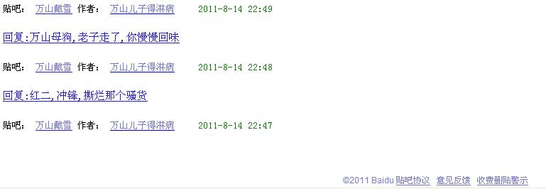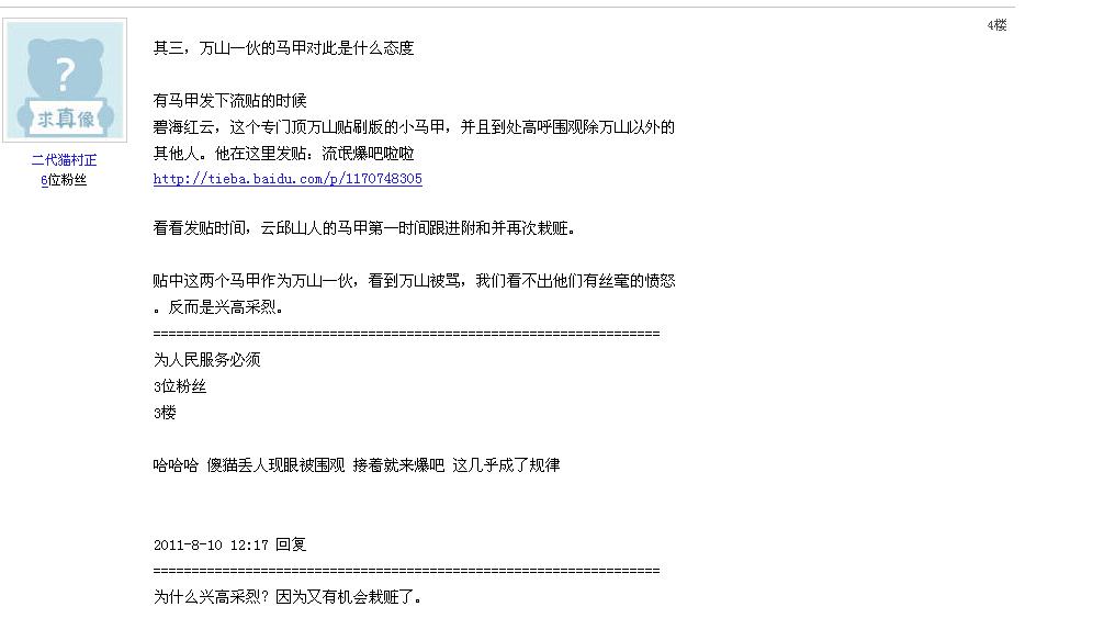 于是万山戴雪再次突破底线,与其喽罗商量通过诬告投诉,让百度撤我的吧主.因其人少,就联合常来贴吧的小右,又跑去民族主义的贴吧,忽悠一些不了解情况的人,污蔑我是独裁,堕落成了三跑云云.这中间,有合谋者鄙视万山戴雪的人品,而退出,并向我提供了这些情况.当然,此人无吧主权利,之后被万山戴雪及其跟班打的很惨.