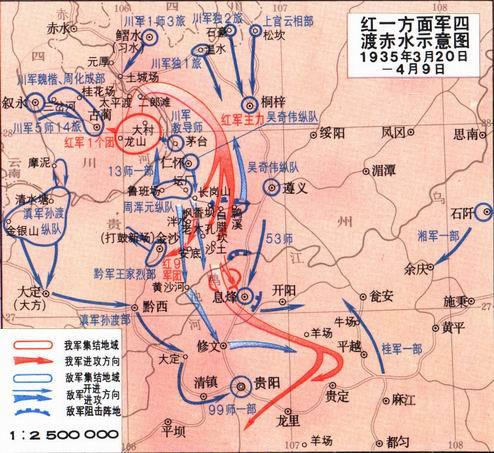 渡过金沙江挥师北上。红军南渡乌江后,开辟了进军云南、从金沙江北渡入川的前景。但在黔滇边境有数旅滇军据守,不利红军北进。毛泽东在部署红军作战行动时指出:只要能将滇军调出来就是胜利。为实现这一战略目标,红军采取了声东击西的战术,首先以部分兵力向黔东的瓮安、黄平方向佯动,摆出东出湖南与红2、6军团会合的姿态,主力则经息烽、扎左,直趋贵阳。此时,蒋介石已由重庆赶赴贵阳坐镇。当时贵阳及近郊守敌仅有4个团,蒋介石感到守备空虚,既怕红军乘虚攻占贵阳,又怕红军东进湖南与红2、6军团会师,故而急调龙云的主力3个旅兼程增援贵阳,令薛岳兵团和湘军何键部在川黔湘边界布防堵截。在滇军主力已完全东调的情况下,红1军团于4月9日突然对贵阳东南之龙里镇实施佯攻,虚张声势,迷惑国军,红军主力却从贵阳、龙里之间突过国军防线,以每天120里的行军速度,向兵力空虚的云南疾进,15日渡过了北盘江,并相继攻克贞丰、龙安、兴仁、兴义等城。蒋介石对红军神速西进大为震惊,急调吴奇伟、周浑元两个纵队和湘军3个师以及滇军一部,沿黔滇公路对红军实施追击。与此同时,原留乌江以北的红9军团,在胜利完成了牵制任务后,也已进至黔西的水城附近地区。