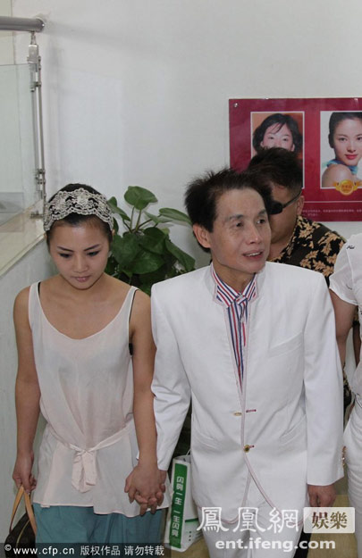 2011年8月22日,郑州,52岁的影视大鳄邓建国携19岁小娇妻黄梓琪现身郑州。邓建国透露,此次来郑州有两个目的,一是为即将开拍的新电视剧《公主出山》选拔演员,二是要在郑州一家朋友开的整容医院做面部老年斑消除手术,以取悦娇妻黄梓琪。图为做完手术后,邓建国和娇妻从整容医院出来。