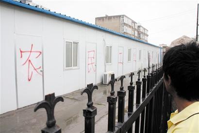 采访过程中,两名中年男子匆匆走过。“他们就是开发商的人,不会都跑了吧?”王永田发现后赶紧跑到开发商的办公室门前,发现果然是铁将军把门,空无一人。工人小王突然变得非常愤怒,翻护栏进入了开发商的办公区,用红色的喷漆在门上写上了“讨要农民工血汗钱”的标语。