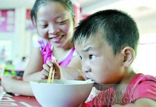 第三幅图片是中午12时35分,何平带着弟弟在食堂吃饭。这姐弟两个真的是很好的姐弟两个。姐姐正在给弟弟夹菜,弟弟张着小嘴,就像是小鸟在等着妈妈喂食一样。看到弟弟吃到了菜,姐姐高兴的两眼都合不上了。弟弟吃一个荤菜,而姐姐就一元钱对付:两毛的饭,八毛的低档菜。这就是伟大的姐姐。他们相亲相爱。而且弟弟已由刚来时候的30斤,长到43斤了。