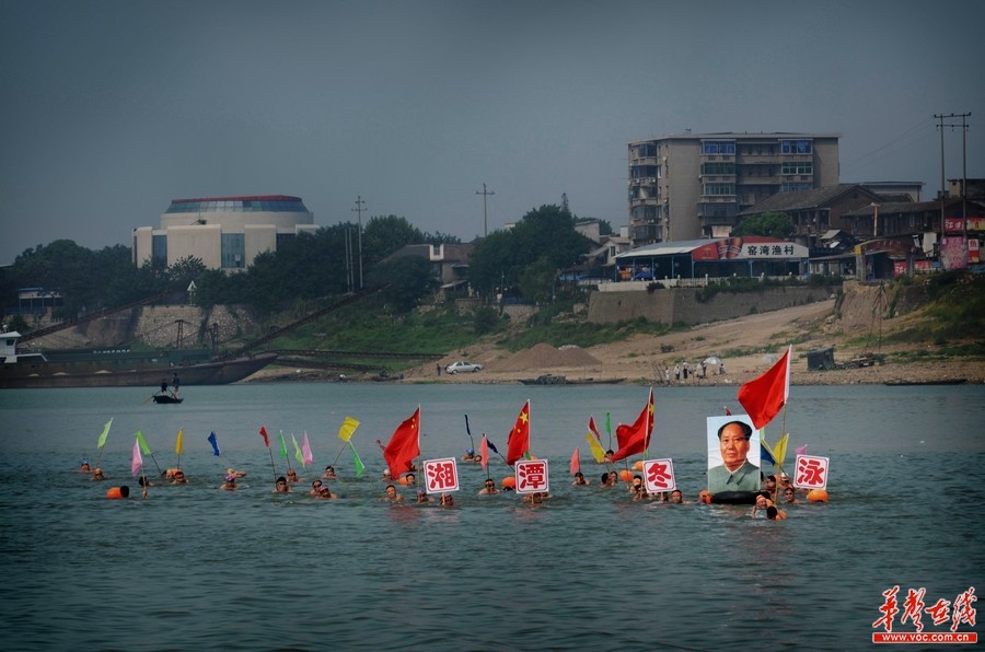 » 湖南湘潭冬泳队抬毛主席画像游泳 全程3000米