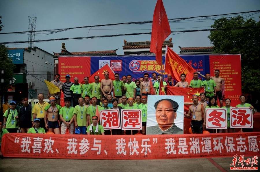9月17日,保护湘江大型漂流环保公益活动途经湘江段的望衡亭附近,受到一批特殊人群的热烈欢迎,他们是湘潭冬泳队的80余名队员。冬泳队员一同陪同漂流队伍,游至湘潭湘江段的关圣殿上岸,全程约3000米,用时40分钟。