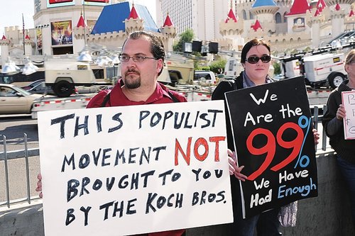 “占领华尔街”游行者自称代表99%的社会民众,高呼“我们是99%”,要和1%的所谓精英阶层对话。