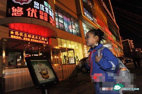10月26日22时左右,演出结束后黄豆豆背着书包离开火锅店,回家她还要写家庭作业、吃饭,23时以后她才能上床睡觉。