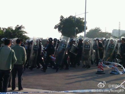 里面调来了,很多突击,防暴警查。。。警车全部停在我们厂中间的马路上,四辆车一排,中间留着。。