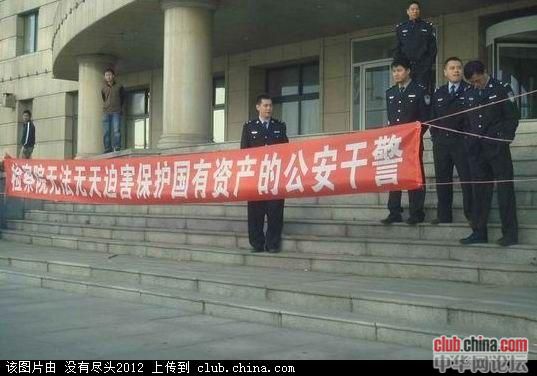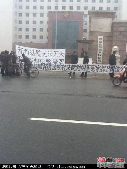 2011年11月16日,一群警察聚集在河南郑州金水区省高级人民法院门口,抗议法院的错判。警察拉开三条白布横幅,上用黑色墨水写着“河南法院无法无天..枉法裁判警察蒙冤..栽赃陷害..法院枉法..”等。
