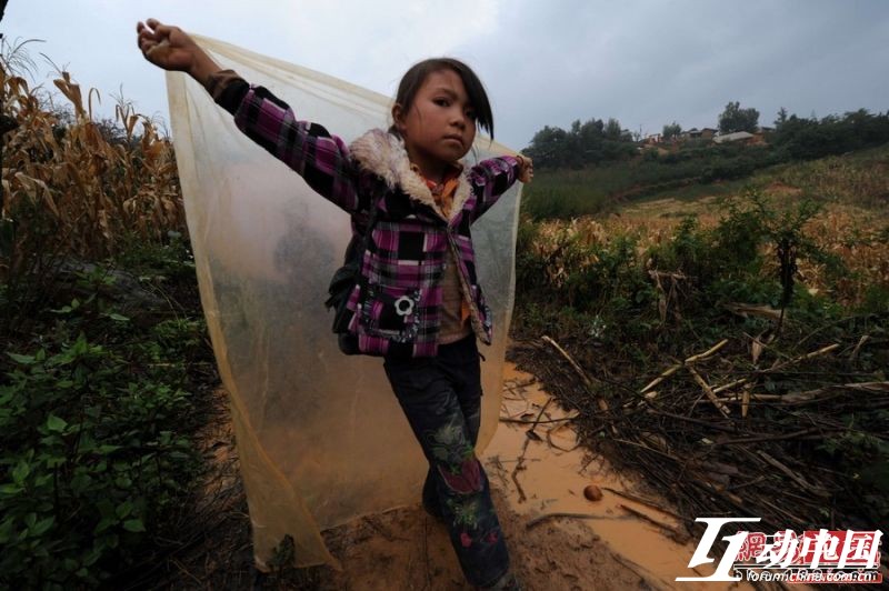马头坡,放学路上披着塑料布回家的孩子。黄兴能 摄