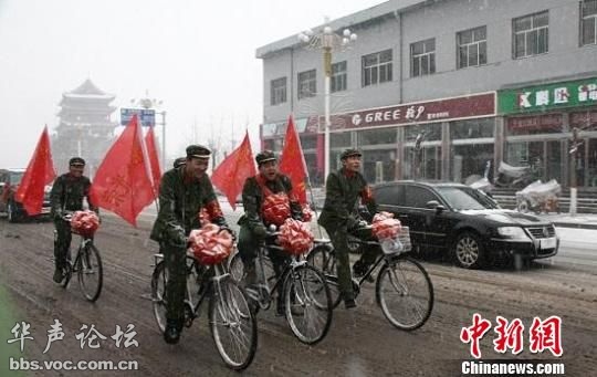 29日,山西省忻州市街头一名男青年身披“军绿”,戴着大红花,冒着鹅毛大雪,在一群“战友”的陪同下,唱着“向前向前,我们的队伍向太阳……”的歌声,骑着6辆“28自行车”组成了一支特殊的迎亲队伍。