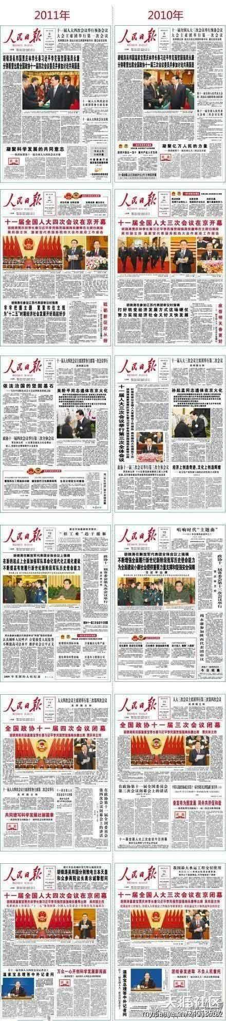 有网友评论称,《人民日报》太稳定了,两年同一天所报导的大会内容居然没有变化。唯一不同的是,大会闭幕的时间2011年的比2010年早了1分钟。