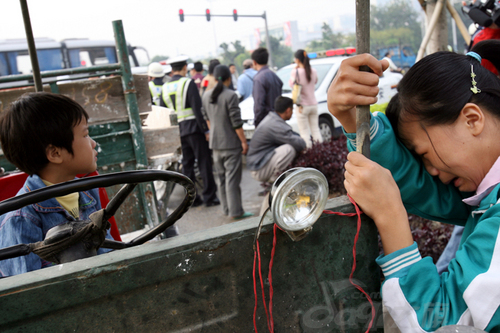 小女孩哭泣着,双手紧紧地抓着爸爸的拖拉机,她不能让交警将车拖走。