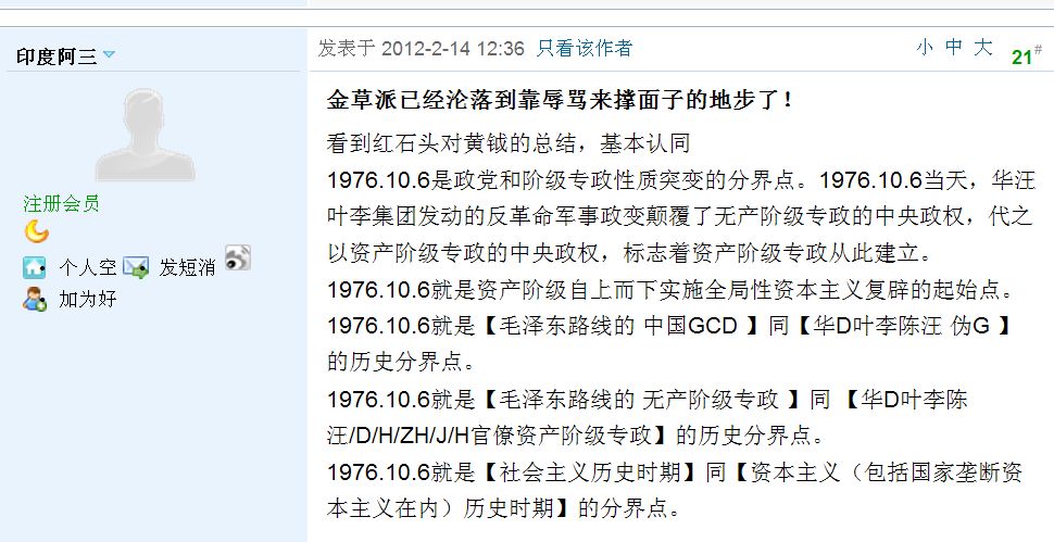 以上这些, 也算是对那两个“左右开弓战当中”和“印度阿三”的回复, 对这两个根本不懂辩证法且小资产阶级个人主义思想严重的家伙, 不仅自己搞垮了自家论坛, 还要再跑到红石头上来上窜下跳, 老是乱发那些莫明其妙、瞎七埝三胡诌的垃圾帖子, 对这样的故意捣蛋鬼, 完全没有回复的必要, 让他们自拉自唱、自生自灭吧!