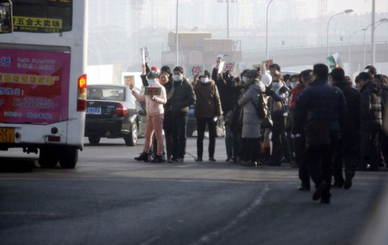2月27日上午8时,山东青岛,200余名万科蓝山的业主聚集在楼盘旁边的变电站门前进行抗议,一群手里举着“尊重生命,还我绿色家园”牌子的居民堵在工地门口,现场有民警在维持秩序。图为业主冲到马路上希望能引起有关部门重视,后被公安部门拉回到人行道上。