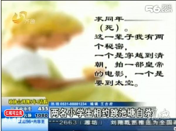 可不嘛,刚刚在56视频网站,看到了一则名为这样的新闻《福建两名小学生跳池塘自杀身亡称要穿越到清朝 》。哎,你说这叫我说什么好呢?现在孩子的内心本来就是寻思缜密,浮想联翩的;反倒是还继续给他们制造这些虚伪的假象,如此以来,我国公民的普遍文化底蕴,又怎会有所提高和觉悟。
