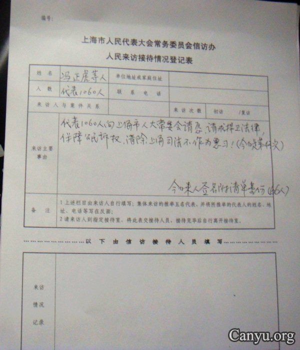 每周一下午是市人大信访接待日,3月12日访民们不约而同地早早等候在信访大厅,不一会儿就有60多个访民各自在签名簿上签到。15时许,访民代表鲁俊、赵迪迪、王扣玛、周雪珍、刘洪贤受众访民委托走进了人大接待室。接待代表的费老师看到我们这些经常惠顾的代表显得很热情,也很无奈。首先由鲁俊代表递上督察简报和上海市民请愿书,接着谈了无数次的关于公民诉权问题——要求费老师反映上级领导,希望早日归还公民诉权;赵迪迪谈了法院无端剥夺公民诉权,还像法院吗?周雪珍和王扣玛满腔愤怒,控诉无法无天的权贵恶势力,任意侵害公民权益的不法行为;莘庄工业区代表谈了一中院静坐151天走向高院以碗代鼓的请愿行动,强烈要求法院尽快立案,给失地农民诉权,还把上海人大主任刘云耕在两会期间登在新闻晨报的讲话给费老师看。刘云耕讲的比唱的还好听,人大要监督“一府两院”,主动介入、切实解决好民生问题等等。费老师说那要快了,政府迟早要解决的,这样的话,我们也听了无数次,就是雷声大没有雨点。人民还要等到何时?法院剥夺公民诉权,把责任推回政府,依法治国的口号天天喊,就是没法立国,不给公民诉权,人民安宁哪有和谐可言。