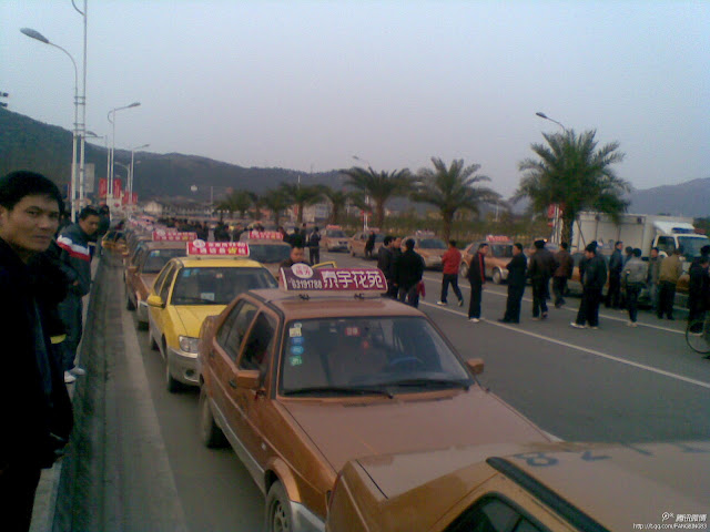 2012年3月21日至23日,浙江温州市平阳县,全体出租车司机罢工3天。数百辆出租车聚集在鳌江火车站广场,当局出动大批警察在场戒备。