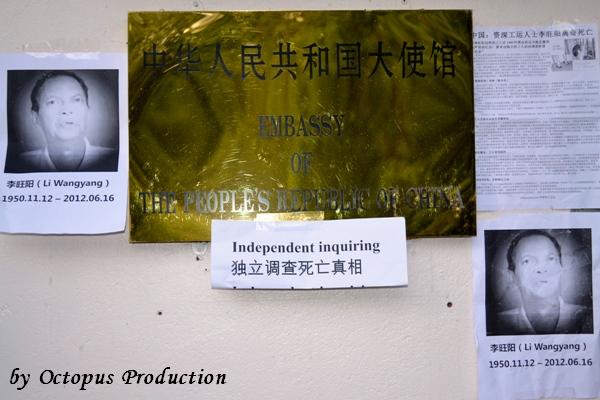 抗议者们手举李旺阳遗像、和“独立调查死亡真相”、“支持中国独立工会”、“为中国工人声张正义”和“结束一党专制”等中英文标语牌缓步走到中国大使馆前。