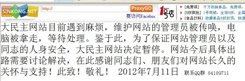 大民主网站目前遇到麻烦,维护网站的管理员被传唤,电脑被拿走,等待处理。鉴于此,为了保证网站管理员以及同志的人身安全,大民主网站决定暂停。网站今后具体出路需要讨论解决,在此感谢同志们、朋友们对网站长久的关怀与支持!此致!敬礼! 2012年7月11日 联系QQ群 84189711