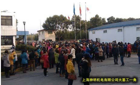 我们是位于上海闵行经济技术开发区南沙路1号的上海神明电机有限公司员工,原来为日资企业,因为资产转置过程中的种种问题(作为工人我们不了解内幕),使资方单方面武断地作出了非法与不合理的措施, 逼迫企业全体约1500多名一线新老员工因无法接受厂方的单方面非人性苛刻条款(大小便不能超过2分钟,超过2次违规既被开除;迟到一次扣50元;新老员工不包住,仅供工作餐;大多数工人工资仅一千多元;同时出台了近50条苛刻条款,残酷地剥削管制工人);同时,资方企图单方面强制削零全体老员工的所有福利与工龄等霸王条款(有很多员工已经在企业工作了近20年)进行了坚强不屈的斗争。他们一次次向工会,公司管理层甚至上级政府有关部门反应情况,希望通过谈判方式予以合理合法解决,然而资方管理层与工会始终置若罔闻,不理不采,上级有关部门也偏袒资方一面推委不问,致使工人因绝望生愤慨,在忍无可忍的前题下,一度把资方管理层数人围堵在办公室里讨要说法。