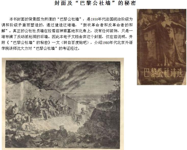 这时,已经是下午5点钟。直到此刻他才轻松地想到,明天这个时候,已经在回国的途中了……经过长时间的考证,这堵雕塑墙的背景终于弄清楚了:在第一次世界大战前夕,法国国内阶级矛盾日益尖锐,统治阶级为了调和阶级矛盾,决定由保尔•沃蒂埃雕塑建造了这堵墙,鼓吹革命者和反革命者的和解。那真正的公社社员墙不在这里,而是在拉雪兹神甫墓地东北角上,它没有任何装饰,而只是布满了反动派枪洞的旧墙。当年,反革命对公社战士的最后一次大屠杀,就是在这堵墙近旁进行的。1893年,被大赦回来的公社战士集钱买了地皮,保护下了这座真正的纪念碑。不过,由于统治阶级的掩盖和欺骗,以讹传讹,一直到现在还在迷乱着人们的视线。