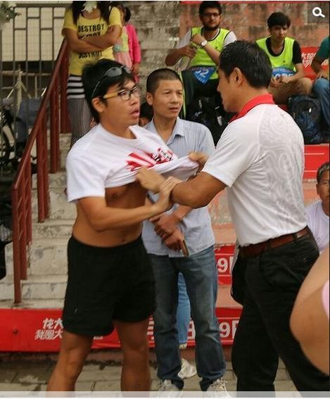 9月6日晚,网名为"泰山摄影学校"的网友在某论坛发布网贴称,当天在泰山举行的第二十八届泰山国际登山节上,一名据说来自天津的30岁左右的男子,穿着印有“大日本帝国海军”字样的T恤衫,随后该男子被现场民众包围。周围民众纷纷对其指责,更有群众愤怒地将其T恤扒掉。该男子却称自己从小在日本长大,在日本就是这样穿,在其他地方穿都没问题,唯独在泰安穿怎么就不行了。执勤民警为防止事态进一步恶化,将其带离现场。