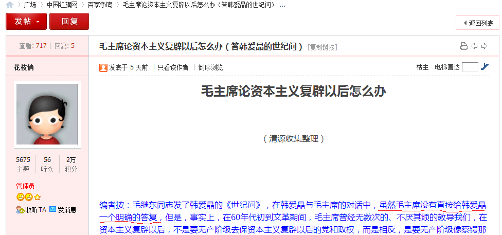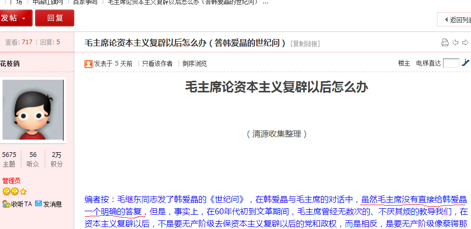 红旗网版主花枝俏在所谓"资本主义复辟后怎么办"的按语中,在说到韩爱晶在毛主席接见时问毛主席“如果中国出现了分裂,你也说自己是毛泽东思想,他也说自己是毛泽东思想,出现了割据混战局面那我们怎么办?”毛主席明明是做了明确回答和指示的,花枝俏却在按语中说“毛主席没有直接给韩爱晶一个明确的答复”。对这种赤裸裸的篡改和抹杀毛泽东思想的行为,我马上发贴指出其错误,但是,不仅把我的发贴给马上删除了,而且把我的这个网名也马上给封死了。