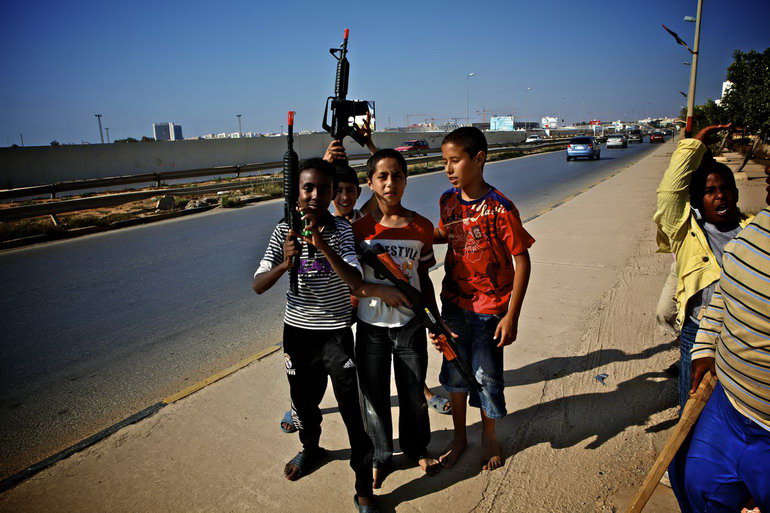 5月29日,在利比亚班加西街头,男孩们拿着各式“武器”玩战争游戏。 战争的内容也渗透到儿童的游戏中。新华社记者才扬摄