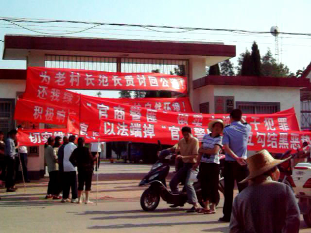 2011年6月3日上午8点多,赵岗乡窑北村 新堰村的40多名农民维权代表打着“积极响应温家宝总理政治体制改革的号召”“为老村长范长贵讨回公道”“还我绿水青山 保护自然环境”“切实维护村民委员会组织法”“以法端掉官商警匪相互勾结的黑恶势力”“官商警匪倒卖土地属于犯罪”等条幅在赵岗乡乡政府门口抗议示威(请看录像和照片,因为警察干扰,所以录像没有完成而很短)。接近九点乡政府才接见代表谈话。请朋友们通过电话了解谈话内容和村民代表的想法和诉求