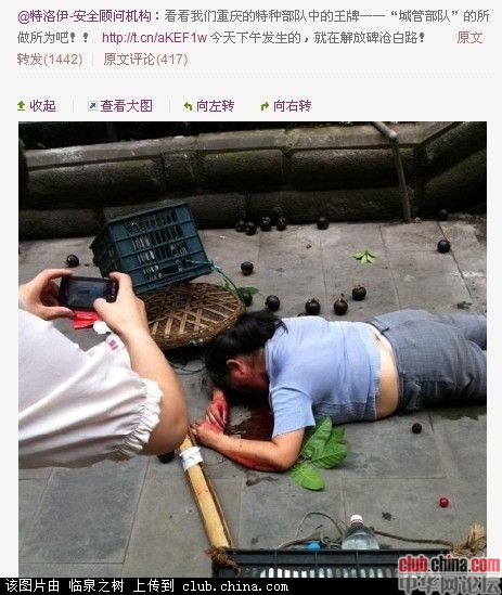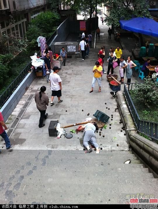 今天下早班,从解放碑王府井百货的小路去红崖洞沧白路做265回家,看见城管在追卖水果的,结果在下梯坎的时候拉扯,把别个卖水果的从梯坎抽了下去,结果城管看出事了,跑老,,好j8牙刷哟,,撒子社会哟,,大家看图嘛,,看起好可怜哟,尿都达出来老