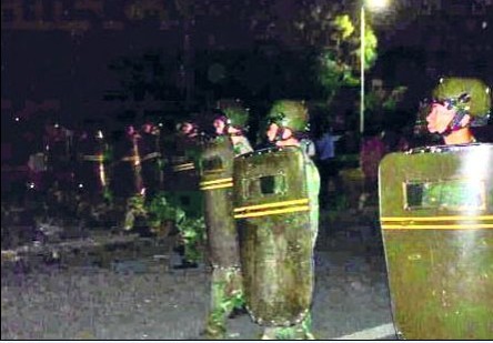 河源紫金县村民指当局漠视大批儿童血铅超标问题,本月17日堵路抗议,大批手持盾牌的防暴警察到场戒备(上图)。