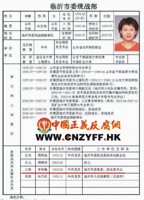 顺便带一句,李洪海的女儿33岁,一个中专毕业生当上临沂市统战部副部长,李洪海解释为女儿好学上进有能力,靠自己本事当上去的。可以肯定地说,这是李洪海、临沂市用人腐败的最好例证,一个连高中都考不起的女孩谈什么好学,一个依仗老爸权力随便可以弄张大学文凭的女人,连这么个事都懒得做,谈什么上进。(附下:临沂市统战部李洪海的女儿33岁李静的个人资料)