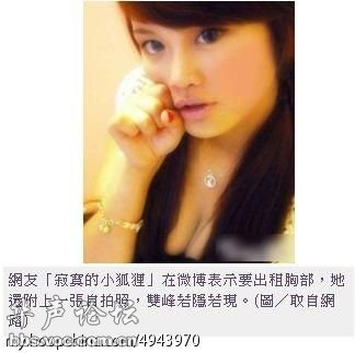起初,我在CNTN博客上看到一篇文章,是谈90后女孩出粗胸部挣钱的文章。一个叫“寂寞小狐狸”的90后女孩在微博中写道:“放假了没事做,天气热又不想出去。呵呵,不过还是让我找到了挣钱的好方法:不知道有没有哪位老板愿意出价把我的胸部当成广告卖给他,嘻嘻,在这画一次2000块,想联系的给我留言啊。”大概是这位90后此条微薄得到很多口水拟或是没谈明出租胸部挣钱做何用,于是,这位“寂寞小狐狸”又发了条微薄:“娟子她们考完试就都换了手机,可是我上哪弄钱啊,怎么都不够花,老妈又不给我。自己想办法吧,事先声明,我可是好女子,又不是卖身的。胡说的我也就忍了,变态的滚远点。”