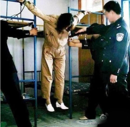 一天在“渣滓洞黑监狱”里,哪个叫“胖子”的暴徒,拿了个麻绳,带了8、9个穿迷彩服的年轻人,四个人把我的胳膊一个人抓一个,拧到背后,另一个穿迷彩服年轻人用麻绳,把我的两个手腕子栓在一起,然后拉到靠防盗门约两米高的铁栅门处,把绳子穿到铁栅门的上边,把我反手吊起来,一个人拉,我的胳膊就象要断了一样,当脚离开地时,另外几个穿迷彩服的年轻人就拿竹棍狠狠的打,手打累了,他们又用脚踹。原来他们这样把我背手吊起来打,是防止我还手,面对这些惨无人道的警察,我想他们就是披着解放军迷彩服外衣的法西斯暴徒,在法西斯暴徒面前,求饶是没有意义的,是他们使我亲身体验了在国民党反动派的渣滓洞,共产党人革命先烈遭受折磨时的感受,想到革命先烈,我作为一个普通共产党员一个革命军人,无非是有人贪污我们工人的买断工龄费,每年工龄买断应付2500元,5000元底金,只给我们每年工龄800元,作为为大多数人谋利益的共产党员向上级部门反映,就遭到如此关押摧残,我把怒火压在心头,一声不吭,汗流如注,最后一直被打的昏过去!从此以后每逢阴天就浑身疼,一点劲都没有。