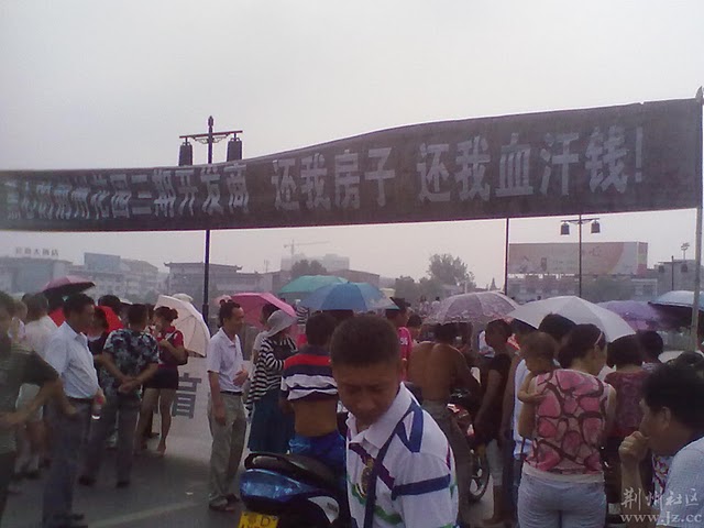 2011年8月1日早上荆州东门路口出现浩荡的群众,整条街被示威人群堵死,原因是荆州花园三期致远上城无良开发商携款私逃,政府不为人民作主,至今,许多业主无法交房,多年血汗钱被骗,气愤之余已没有什么途径解决,只有采取引起社会关注的形式。许多业主均是一次性付清,血泪控诉! 后来政府出动特警驱散群众,期间发生冲突。