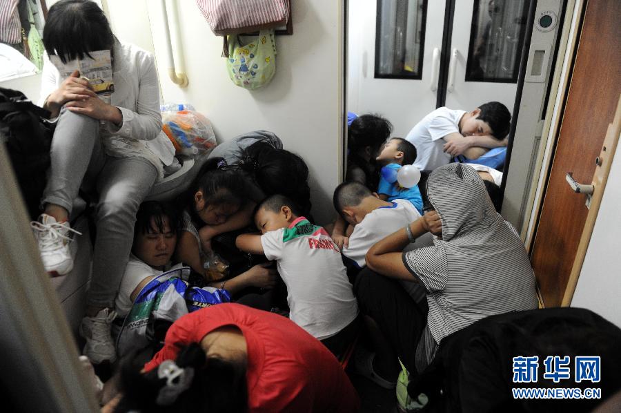 8月22日,旅客们在列车洗脸间就地睡觉。 8月22日晚,记者乘坐北京西至南昌的Z67次列车,用镜头记录了这趟列车上旅客们的艰辛返乡路。由于暑假即将结束,“小候鸟”们随同亲人返乡开学,与高校学生流及探亲流等旅客叠加,客运压力加大。列车不少旅客反映,提前5天排队买票,才买了个无座。新华社记者周科摄